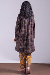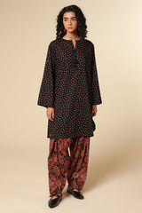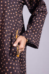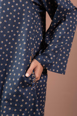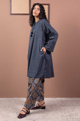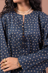 A printed shirt with a round neckline and V-slit adorned with tassel detailing, featuring side pockets for ease. Paired with a printed classic-fit shalwar.