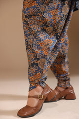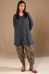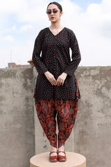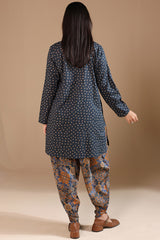 A classic-fit printed shirt with a round neckline and loop buttons along the front slit. Paired with complementary printed tulip shalwar.