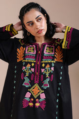Appliquéd paneled shirt with a round neckline and V-slit, adorned with delicate bead embellishments. Vibrant appliqué and embroidered details add an artisanal touch. Paired with a classic-fit shalwar for a balanced, refined look.