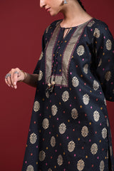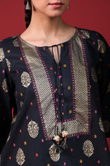 A classic-fit printed shirt with a round neckline and V-slit, adorned with tassel detailing. Paired with matching printed classic-fit shalwar.