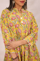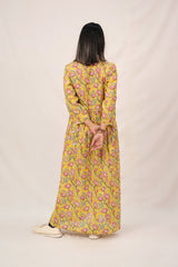 The serene grove of ruby fruit treasure – an A-line hand block printed dress featuring a band neckline with a graceful V-slit, enhanced with delicate button detailing. Featuring gathers at the waist and crochet lace detailing on the sleeve hems, this versatile dress is perfect for the summer days.