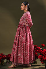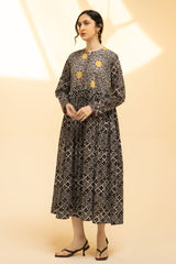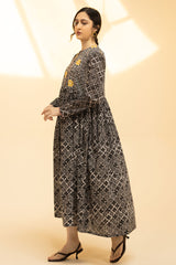 Printed long flared dress featuring a low band neckline with loop buttons along the front slit. Dori accents along the neckline and sleeve hems, while soft gathers at the empire waist create a fluid, flared silhouette.