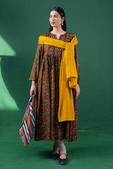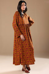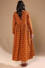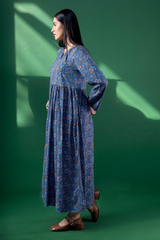 A printed long flared dress with a round neckline and V-slit. Gathers along the empire waist enhance the silhouette, for a chic, flowy vibe.