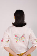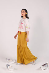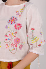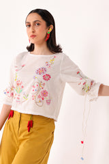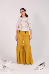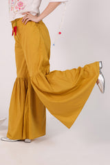 A handcrafted shirt with a round neckline and gathered sleeves with tassel accents. Lace trims add a delicate finish to the sleeve and shirt hems. The lively embroidery throughout brings the piece to life. Paired with a gharara adorned with playful mirchi tassel detailing for a bold and funky flair.