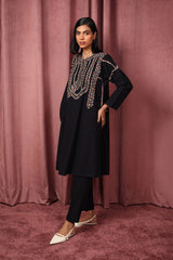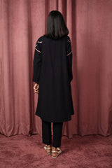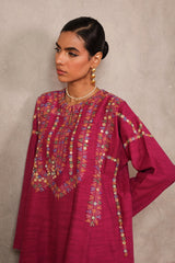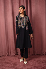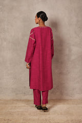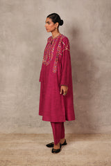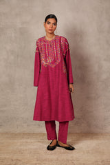 This loose-fit kurta features a round neckline with a V-slit, beautifully enhanced by intricate, colorful embroidered taanka work that extends to the sleeves. The sleeve hems are adorned with bead tassels, adding a touch of charm. Paired with solid-colored straight-fit trousers, this ensemble effortlessly blends traditional craftsmanship with contemporary elegance.