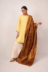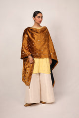Designed in soft, luxurious velvet, this shawl features intricate Marorri taanka embroidery along the borders, accented with delicate tassels at the corners. Its elegance makes it a perfect pairing for both formal and semi-formal attire.