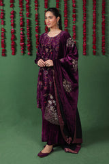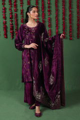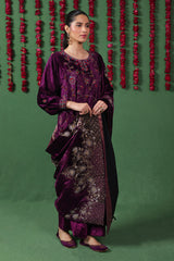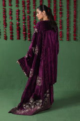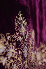 This exquisite velvet shawl is enhanced with Marorri and velvet taanka embroidery with hints of gold and silver. The shawl is adorned with shimmery purple zarri finishing.