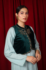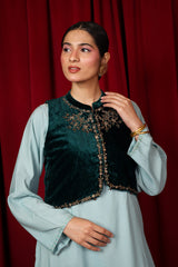 A velvet chaand koti with a band neckline, embellished with sequin and taanka work on the neckline, front slit, and the koti’s hem. The open front features chaand motifs on the neckline and back, adding an immortal touch of refinement and grace.