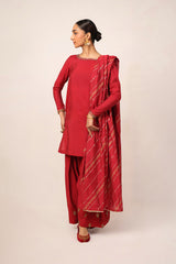 A classic-fit solid-hued formal kurta features a round neckline, adorned with delicate golden taanka and colorful sequin work on both the neckline and sleeve hems. Paired with matching solid-hued wide-leg trousers, enhanced with golden embroidered motifs at the bottom, comes with an inner (shameez) for ease. The look is completed with a printed pattern dupatta, enhanced with a golden frill trim.