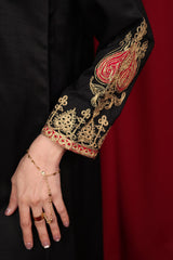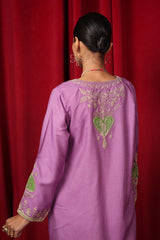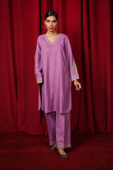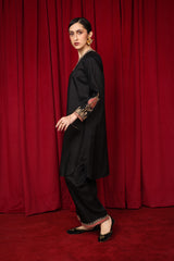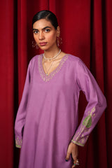 Elevate your style with this loose-fit, solid-colored kurta featuring a V-neckline, intricately enhanced with subtle dori embroidery. The sleeves are beautifully detailed with paisley motifs and dori-embroidered borders, while the back of the kurta showcases refined dori work. The color pops in the embroidery offer a classic appeal. Paired with matching relaxed-fit trousers, featuring dori-embroidered ankle hems with a pop of color.