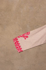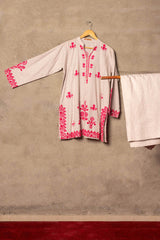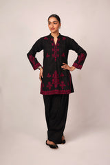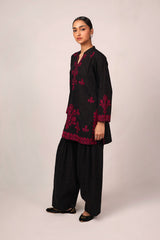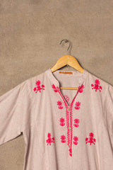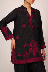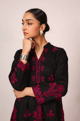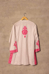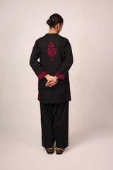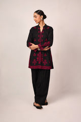A textured, handcrafted embroidered kurta featuring a band neckline with a V-slit, followed by buttons on the front placket. The design boasts intricate embroidery on the neckline, extending all over the shirt and sleeves. Embroidered side slits and a delicately crafted motif on the back add an artisanal charm. Paired with matching straight trousers.