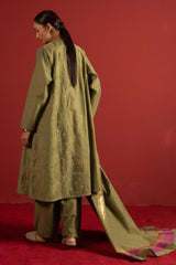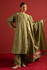 Embroidered paneled kurta with a round neckline, detailed with soft pleating and loop button accents along the front slit. Paired with a classic-fit shalwar finished with embroidered detailing at the ankle hems. Styled with a dupatta featuring lurex borders for a refined, classic finish.