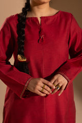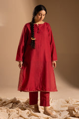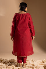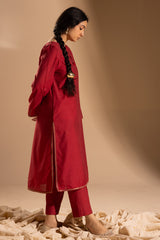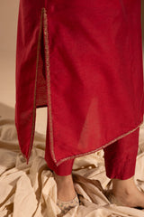 Luxury classic-fit A-line shirt with a round neckline and V-slit, adorned with refined tassel detailing. Delicate embroidery accents the sleeve hems, side slits, and shirt hem. Paired with straight-fit trousers.