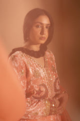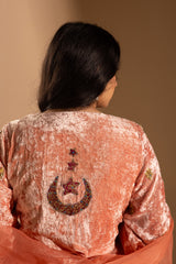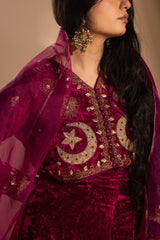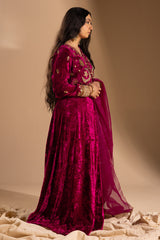 Luxurious crushed velvet embroidered blouse, detailed with loop buttons along the front slit and delicate embroidery enhanced with subtle gota detailing. Paired with a generously flared Lehnga for graceful movement. Styled with an organza dupatta finished with scattered sequin accents and delicate lace detailing along the edges for an elevated festive look.