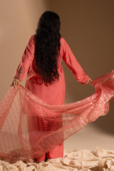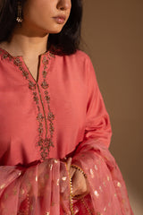 Rich, gold-speckled base classic-fit shirt, adorned with delicate embroidery along the neckline and sleeves, enhanced with subtle sequin and bead embellishments. Finished with refined gota lace detailing along the edges. Paired with a classic farshi shalwar and comes with an inner for added comfort. Styled with an organza lurex dupatta, finished with elegant gota lace detailing.