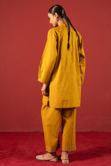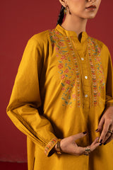 Hand-embroidered classic-fit shirt with a low band neckline and a buttoned front placket. Delicate embroidery enhances the bodice and cuffed sleeve hems, adding refined artisanal detail. Paired with culottes finished with embroidered borders.