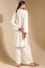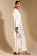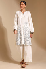 Embroidered classic-fit shirt with a round neckline and V-slit, finished with delicate button detailing and subtle stitching along the sleeve hems. Paired with classic culottes.