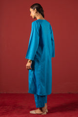 Self-embroidered classic fit paneled kurta with a round neckline and V-slit. Paired with classic straight-fit trousers.