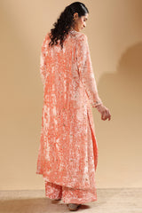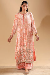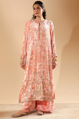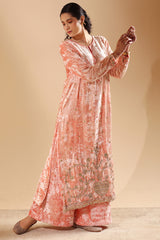 Luxurious crushed velvet classic-fit shirt with a round neckline, adorned with rich embroidery and delicate gota detailing along the front slit. Paired with matching velvet culottes for an elevated festive look.