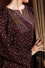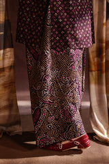 A classic-fit printed A-line shirt with a round neckline and V-slit, featuring mukaish detailing on the bodice. Side pockets for ease and comfort. Paired with a matching printed farshi shalwar for a graceful look.