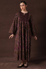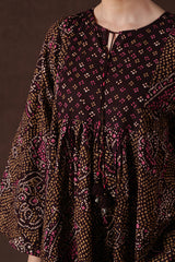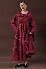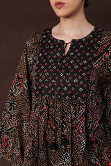 A classic fit long flared bandhani-printed dress with a round neckline and V-slit, adorned with tassel detailing.Gathers on the bodice enhance the flare, creating a graceful silhouette.