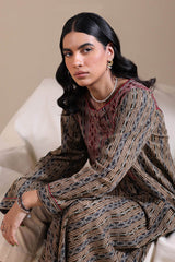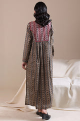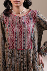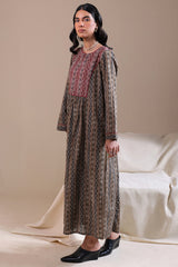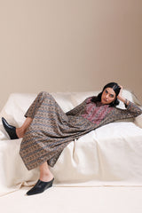 A long, flared A-line printed shirt with a round neckline and V-slit, adorned with loop-button detailing and finished with cuffed sleeves for an traditional look.