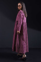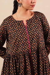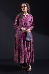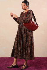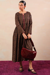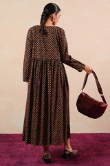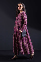 A printed flared dress with a round neckline and V-slit, adorned with dori piping along the neckline and sleeve hems. Gathered at the empire waist, it creates a flared silhouette.