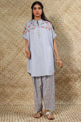 Relaxed-fit embroidered shirt with a low band neckline and subtle batwing sleeves, finished with fine stitching detail along the hems. Designed with a rounded hemline. Paired with a coordinated printed classic-fit shalwar.
