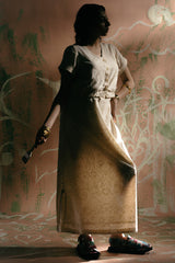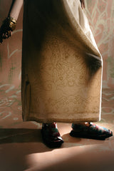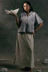 A white-on-white embroidered skirt, fully lined and finished with buttons and a side slit for ease. It evokes an artist’s canvas come alive, where fluid artistry meets structured form.