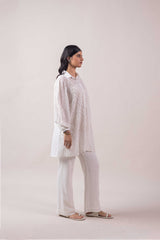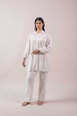 Custom-made Schiffli straight-fit trousers crafted in breathable fabric, featuring eyelet embroidery for a refined touch. The clean silhouette offers a versatile fit, perfect for pairing with a variety of kurtas and tunics.