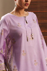 Hand-block printed classic-fit shirt with a keyhole neckline adorned with delicate gota tassel accents. Subtle gota detailing traces the neckline, side slits, and sleeve borders. Paired with straight-fit trousers finished with refined gota accents along the hemline.