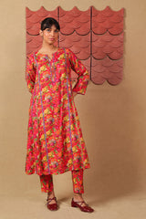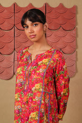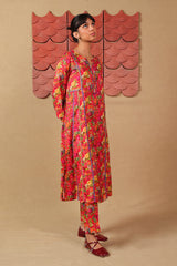 A loose fit panelled printed shirt with round neckline with V slit and dory detailing on neckline aand panels. Paired with a matching printed straight fit trouser.