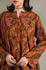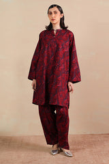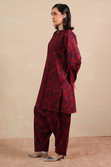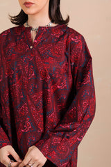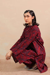 A classic-fit printed shirt with a round neckline and V-slit, adorned with button embellishment and soft pleat detail at the back. Paired with matching printed classic-fit shalwar.