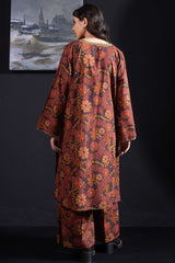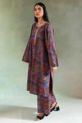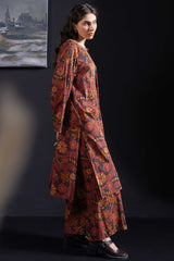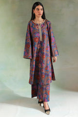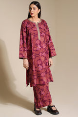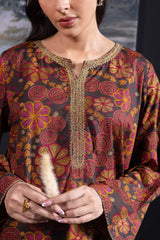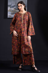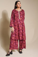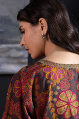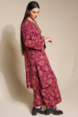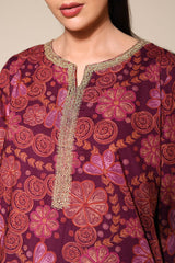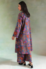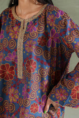 An A-line printed shirt with a round neckline and V-slit, detailed with delicate embroidery on the neckline and sleeve hems.. Paired with matching printed culottes.