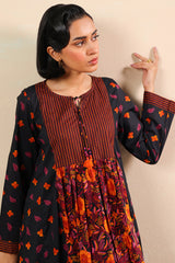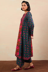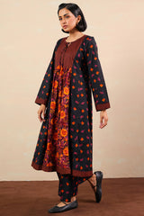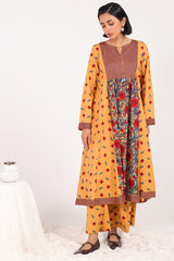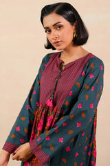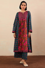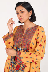 An A-line printed shirt with a round neckline and V-slit, adorned with tassel detailing. Paired with printed culottes for a refined look.
