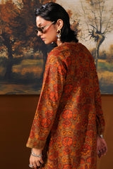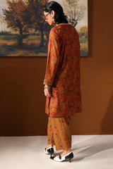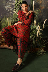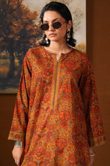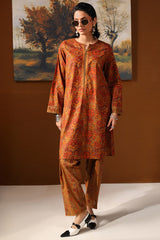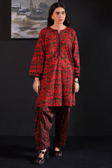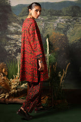 A printed paneled kurta with a round neckline, adorned with delicate lace detailing on the front placket. The sleeve hems mirror the same lace accents. Paired with a printed classic-fit shalwar, finished with lace detailing.