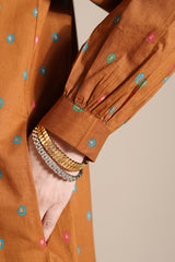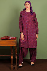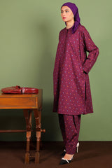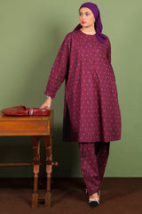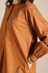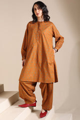 A loose-fit printed shirt with a round neckline and buttons along the front placket, adorned with gold print for a refined touch. It features cuffed sleeves, soft pleated detailing at the back, and side pockets for functionality and ease. Paired with matching printed classic-fit shalwar for a coordinated, stylish look.