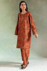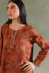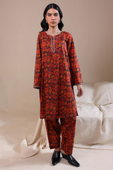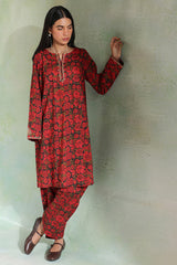 A classic-fit printed shirt with a round neckline and V-slit, adorned with delicate embroidered detailing on the neckline and sleeve hems. Paired with a matching printed classic-fit shalwar.