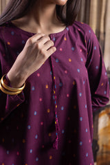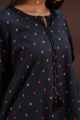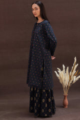A relaxed-fit gold-printed A-line shirt featuring a keyhole neckline with tassel detail. Paired with a matching gold-printed gharara for a timeless, classic look.