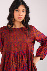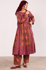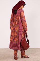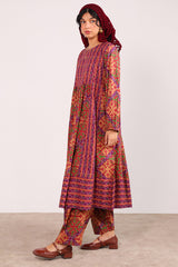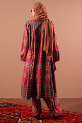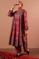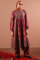 Shyrdak-printed flared frock with a round neckline. Gathers at the waist add a graceful flare to the silhouette. Cinched sleeves complete the look. Paired with matching printed classic-fit shalwar.