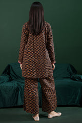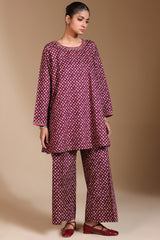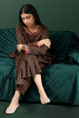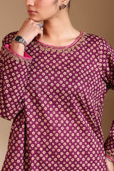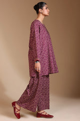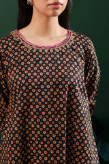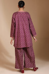 A classic-fit A-line printed shirt with a round neckline, adorned with delicate embroidered details along the neckline and sleeve hems. Paired with matching printed culottes for a coordinated look.