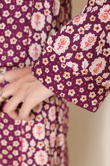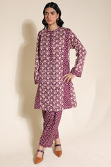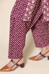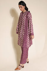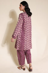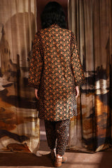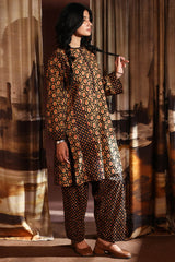 An A-line paneled printed shirt with a low band neckline and buttons along the front placket, paired with classic-fit printed shalwar for a graceful look.