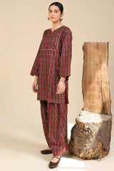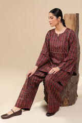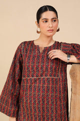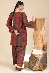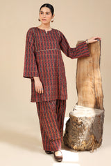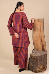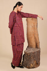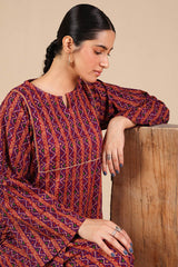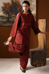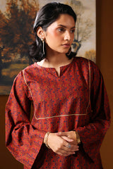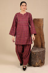 Printed in deep hues, this classic-fit shirt features a round neckline with a V-slit, adorned with gota lace detailing on the bodice. Paired with a matching printed farshi shalwar, enhanced with stitching details for a timeless look.