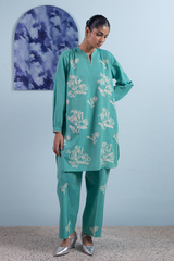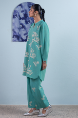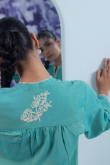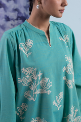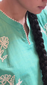 Classic-fit embroidered shirt with a low band neckline and v-slit, adorned with crochet lace detailing along the neckline and sleeve hems. Designed with gathers on the shoulders and back for a softly flared silhouette, finished with cuffed sleeves and a rounded hem. Paired with embroidered culottes.