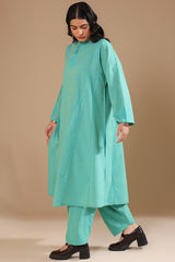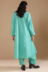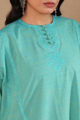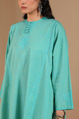 An embroidered paneled kurta adorned with loop buttons along the front slit. Delicate embroidery adorns the neckline, sleeves, and panels, adding a touch of timeless grace. Paired with a classic-fit shalwar for a refined, traditional look