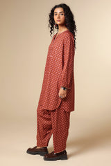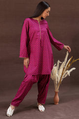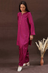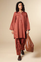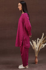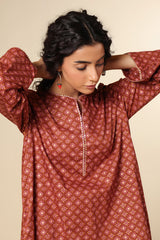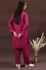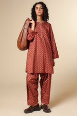 A classic-fit printed shirt with a round neckline and V-slit, adorned with gota lace detailing on the neckline and sleeve hems. Paired with a matching printed classic-fit shalwar, finished with gota lace on the hemline.