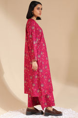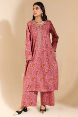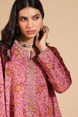 A printed A-line shirt with a round neckline and V-slit, adorned with delicate embroidery on the neckline and sleeve hems. Paired with matching printed culottes for a coordinated look.