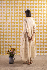 An Anarkali-style block-printed frock features a round neckline accented with dori piping and tassel detailing. The bodice showcases subtle floral motifs, while gathers at the empire waist create a graceful flare. Finished with cuffed sleeves and all-over block prints, perfect for versatile pairing.