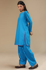 Classic-fit embroidered shirt with a round neckline and side slit, finished with delicate lace detailing. Designed with subtle puff sleeves for a relaxed silhouette. Paired with a classic-fit shalwar, finished with lace detailing along the ankle hemline.