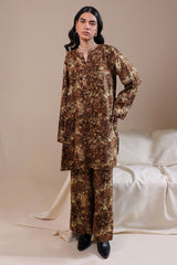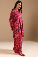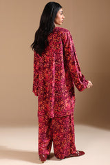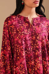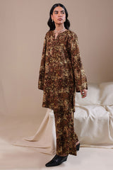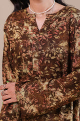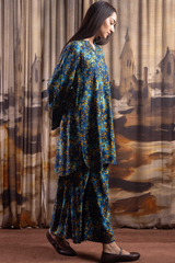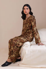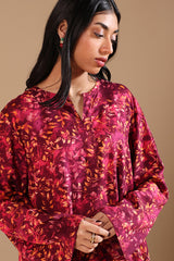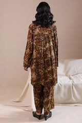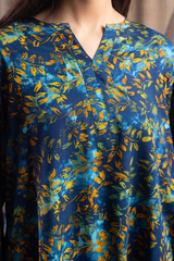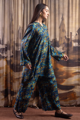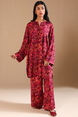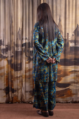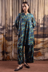 A classic-fit printed shirt with a round neckline and Y-shaped placket, finished with a rounded hemline. Paired with matching printed culottes for a coordinated look.